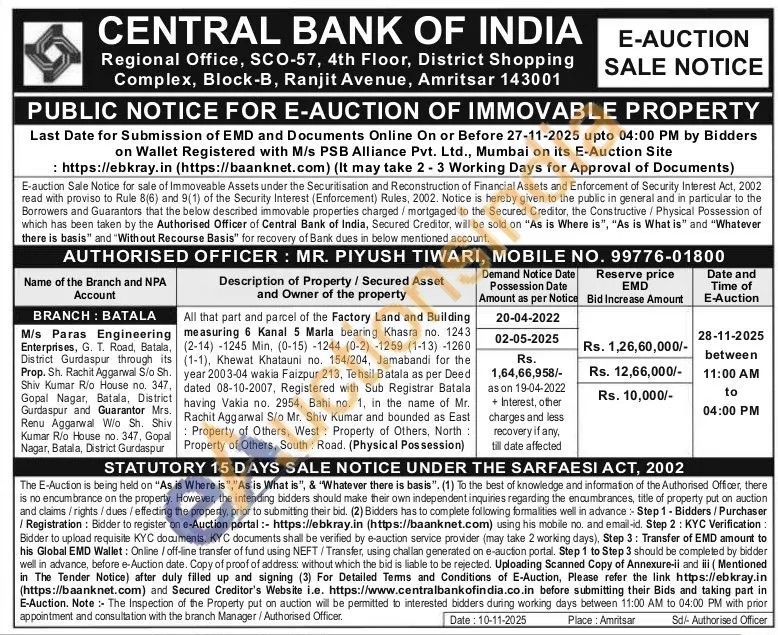 All that part and parcel of the Factory Land and Building measuring 6 Kanal 5 Marla bearing Khasra no. 1243 (2-14)-1245 Min, (0-15) -1244 (0-2) -1259 (1-13) -1260 (1-1), Khewat Khatauni no, 154/204, Jamabandi for the year 2003-04 wakia Faizpur 213, Tehsil Batala as per Deed dated 08-10-2007, Registered with Sub Registrar Batala having Vakia no. 2954, Bahi no. 1, in the name of Mr. Rachit Aggarwal S/o Mr. Shiv Kumar and bounded as East Property of Others, West: Property of Others