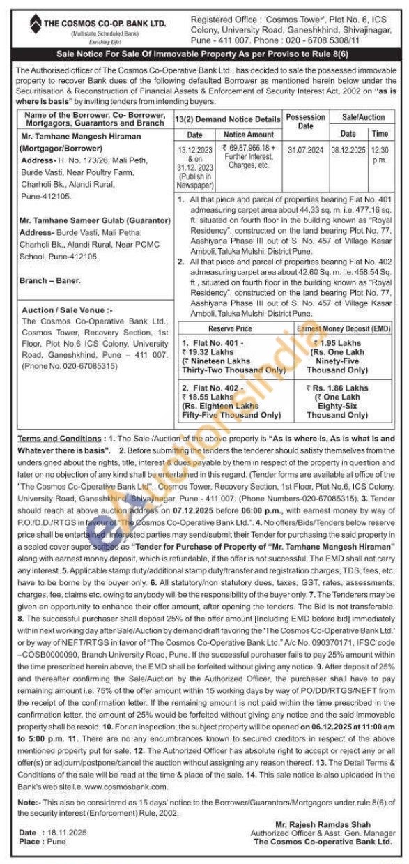 2. All that piece and parcel of properties bearing Flat No. 402 admeasuring carpet area about 42.60 Sq. m.ie. 458.54 Sq ft., situated on fourth floor in the building known as "Royal Residency, constructed on the land bearing Plot No. 77, Aashiyana Phase III out of S. No. 457 of Village Kasar Amboli, Taluka Mulshi, District Pune.