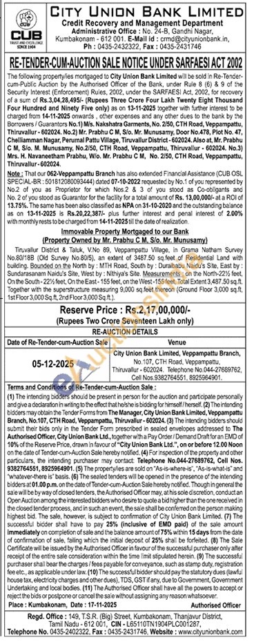 Tiruvallur District & Taluk, V.No 89, Veppampattu Village, in Grama Natham Survey No.80/18B (Old Survey No 80/5), an extent of 3487.50 sq. feet of Residential Land with building. Bounded on the North by: MTH Road, South by: Duraibabu Naidu's Site, East by: Sundarasanam Naidu's Site, West by: Nithiya's Site. Measurements on the North-22% feet, On the South-22% feet, On the East-155 feet, on the West-155 feet, Total Extent 3,487.50 sq.ft. Together with the superstructure measuring 9,000 sq. feet thereon (Ground Floor 3,000 sq.ft. 1st Floor 3,000 Sq.ft, 2nd Floor 3,000 Sqft.).