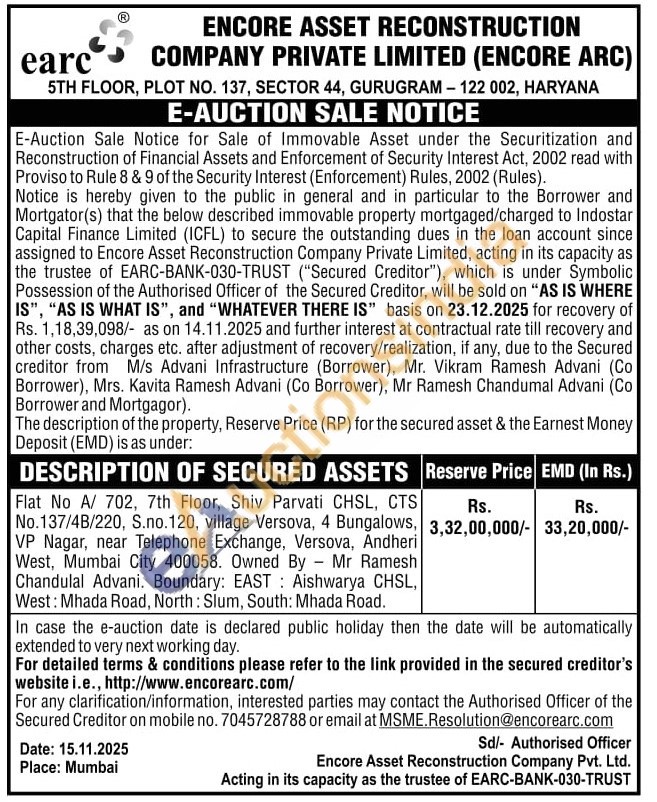 Flat No A/ 702, 7th Floor, Shiv Parvati CHSL, CTS No.137/48/220, S.no.120, village Versova, 4 Bungalows, VP Nagar, near Telephone Exchange, Versova, Andheri West, Mumbai City 400058. Owned By Mr Ramesh Chandulal Advani. Boundary: EAST Aishwarya CHSL, West: Mhada Road, North: Slum, South: Mhada Road.