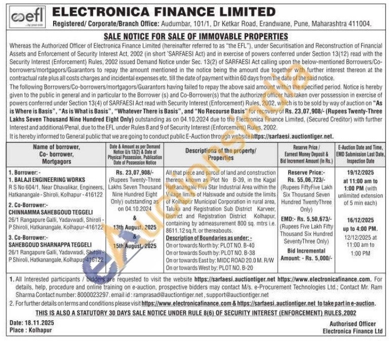 All that piece and parcel of land and construction thereon known as Plot No B-39, in the Kagal Hatkanangale Five Star Industrial Area within the Village limits of Halswade and outside the limits of Kolhapur Municipal Corporation in rural area. Taluka and Registration Sub District Karveer, District and Registration District Kolhapur, containing by admeasurement 800 sq. mtrs ie. 8611.12 sq.ft. or thereabouts. Description of Boundaries as under:- On or towards North by: PLOT NO. B-40 On or towards South by: PLOT NO. B-38 On or towards East by: MIDC ROAD 20.0 M. R/W On or towards West by: PLOT NO. B-20