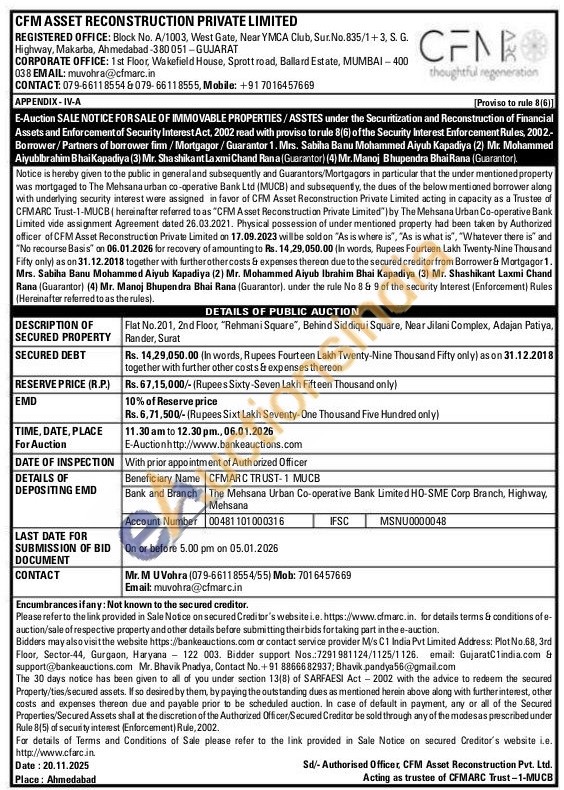 Flat No. 201, 2nd Floor, "Rehmani Square", Behind Siddiqui Square, Near Jilani Complex, Adajan Patiya, Rander, Surat