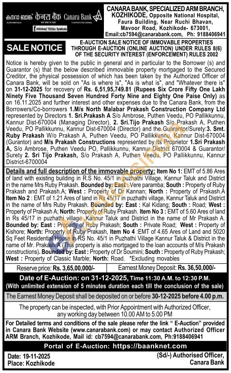 of land with existing building in R.S No. 45/1 in puzhathi Village, Kannur Taluk and District in the name Mrs Ruby Prakash. Bounded by: East: Vere paramba; South: Property of Ruby Prakash and Prakash.A; West: Property of Dr Kannan; North Property of Prakash.A Item No 2: EMT of 1.21 Ares of land in Rs 45/17 in puzhathi village, Kannur Taluk and District in the name of Mrs Ruby Prakash. Bounded by: East: Kal Kidang; South: Road; West: Property of Prakash A; North: Property of Ruby Prakash. Item No 3: EMT of 5.60 Ares of land in Rs 45/17 in puzhathi village, Kannur Taluk and District in the name of Mr Prakash A. Bounded by: East: Property of Ruby Prakash; South: Private Road; West: Property of Kishore; North: Property of Ruby Prakash, Item No 4:EMT of 4.65 Ares of Land and 5020 Sq Feet Residential House in RS No. 45/1 in Puzhathi Village Kannur Taluk & District in the name of Mr. Prakash A (This property is also mortgaged to the loan accounts of M/s Prakash constructions). Bounded by: East: Property of Dr Soumini; South: Property of Ruby Prakash; West: Property of Classic Marble; North: Road. "Excluding movables