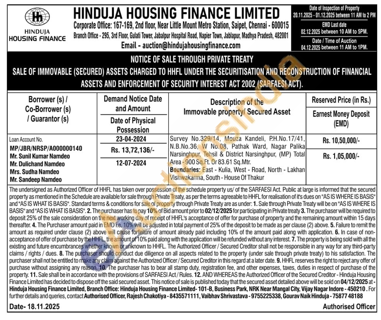 Contact Authorised Officer, Rajesh Chakotiya-8435571111, Vaibhav Shrivastava -9755225338, Gourav Naik Hinduja-7587748188