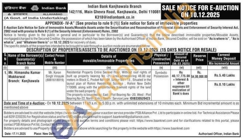 Residential Property Entire Second Floor, Without roof rights of built up property bearing No -21. Area admeasuring 48.00 sqr meters in Block C. Pocket No-04, Sector No-15, Situated in the layout plan of Rohini Residential Scheme Rohini New Delhi 110089, along with the proportionate freehold rights of the land under the said property. The property is bounded by: East: Plot Bearing No 20, West: Plot Bearing No-22 North Entry, South: Service Lane IDI8330520423