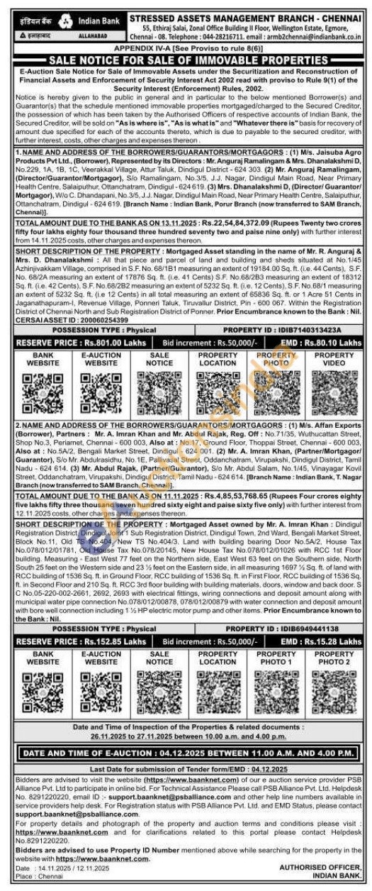 Mortgaged Asset standing in the name of Mr. R. Anguraj & Mrs. D. Dhanalakshmi All that piece and parcel of land and building and sheds situated at No. 1/45 Azhinjivakkam Village, comprised in S.F. No. 68/181 measuring an extent of 19184.00 Sq. ft. (Le. 44 Cents), S.F. No. 68/2A measuring an extent of 17876 Sq. ft. e. 41 Cents) S.F. No.68/283 measuring an extent of 18312 Sq. ft. (e. 42 Cents), S.F. No.68/282 measuring an extent of 5232 Sq. ft. (Le. 12 Cents), S.F. No.68/1 measuring an extent of 5232 Sq. ft. (ie 12 Cents) in all total measuring an extent of 65836 Sq. ft. or 1 Acre 51 Cents in Jaganathapuram-1, Revenue Village, Ponneri Taluk, Tiruvallur District, Pin 600 067. Within the Registration District of Chennai North and Sub Registration District of Ponner. Prior Encumbrance known to the Bank: Nil. CERSAIASSET ID: 200060254399