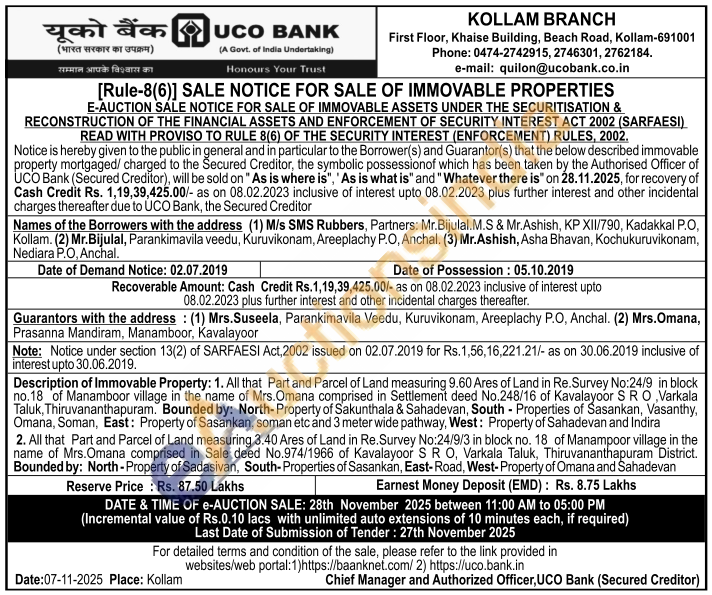 All that Part and Parcel of Land measuring 9.60 Ares of Land in Re. Survey No:24/9 in block no.18 of Manamboor village in the name of Mrs. Omana comprised in Settlement deed No.248/16 of Kavalayoor S RO, Varkala Taluk, Thiruvananthapuram.
