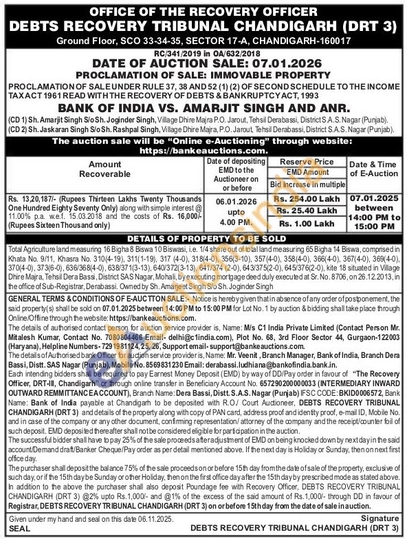 Total Agriculture land measuring 16 Bigha 8 Biswa 10 Biswası, i.e. 1/4 share out of total land measuring 65 Bigha 14 Biswa, comprised in Khata No. 9/11, Khasra No. 310(4-19), 311(1-19), 317 (4-0), 318(4-0), 356(3-10), 357(4-0), 358(4-0), 366(4-0), 367(4-0), 369(4-0), 370(4-0), 373(6-0), 636/368(4-0), 638/371(3-13), 640/372(3-13), 641/374 (2-0), 643/375(2-0), 645/376(2-0), kite 18 situated in Village Dhire Majra, Tehsil Dera Bassi, District SAS Nagar, Mohali, byexecuting mortgage deed duly executed at Sr. No. 8706, on 26.12.2013, in the office of Sub-Registrar, Derabassi, Owned by Sh. Amarjeet Singh Sio Sh. Joginder Singh