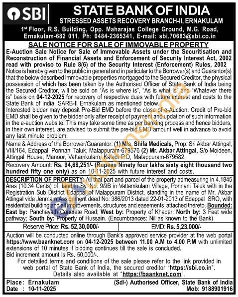 All that part and parcel of the property admeasuring in 4.1845 Ares (10.34 Cents) of land in Sy. No. 9/9B in Vattamkulam Village, Ponnani Taluk with in the Registration Sub District Edappal of Malappuram District, standing in the name of Mr. Akbar Attingal vide Jenmam Assignment deed No: 386/2013 dated 22-01-2013 of Edappal SRO, with residential building and all improvements, structures and easements attached thereto. Bounded: East by: Panchayath Concrete Road; West by: Property of Khader; North by: 3 Feet wide pathway, South by: Property of Hussain. (Encumbrances: Nil as known to the Bank)