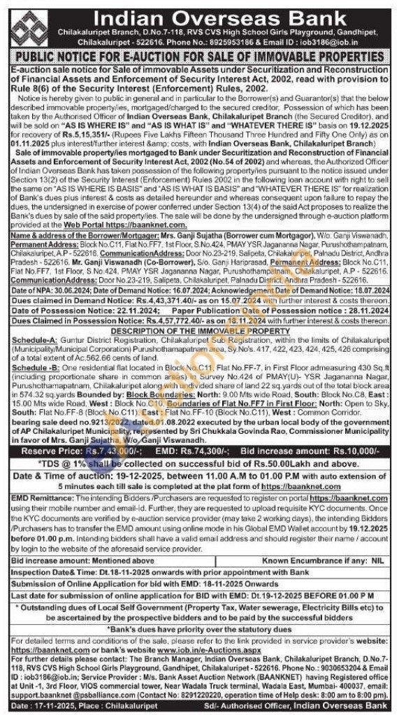 Schedule-A: Guntur District Registration, Chilakaluripet Sub Registration, within the limits of Chilakaluripet (Municipality/Municipal Corporation) Purushothamapatnam area, Sy. No's. 417, 422, 423, 424, 425, 426 comprising of a total extent of Ac. 562.66 cents of land Schedule -B: One residential flat located in Block No.C11, Flat No.FF-7, in First Floor admeasuring 430 Sq.ft (including proportionate share in common areas) in Survey No.424 of PMAY(U)- YSR Jagananna Nagar, Purushothamapatnam, Chilakaluripet along with undivided share of land 22 sq.yards out of the total block area in 574.32 sq yards Bounded by: Block Boundaries: North: 9.00 Mts wide Road, South: Block No.CB, East: 15.00 Mts wide Road, West: Block No.C10. Boundaries of Flat No. FF7 in First Floor: North: Open to Sky, South: Flat No.FF-B (Block No. C11), East: Flat No. FF-10 (Block No.C11), West: Common Corridor. bearing sale deed no.9213/2022, dated 01.08.2022 executed by the urban local body of the government of AP Chilakaluripet Municipality, represented by Sri Chukkala Govinda Rao, Commissioner Municipality in favor of Mrs. Ganji Sujatha, W/o. Ganji Viswanadh