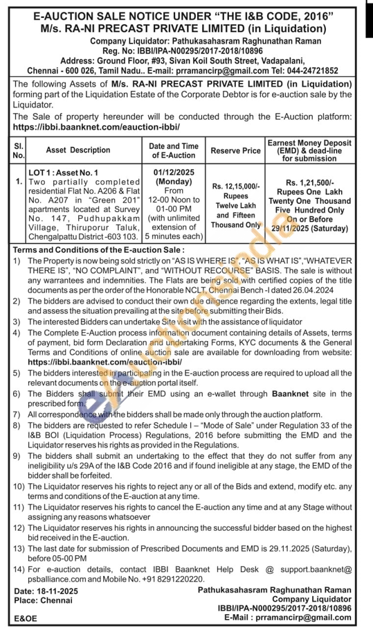 Two partially completed residential Flat No. A206 & Flat No. A207 in "Green 201 apartments located at Survey No. 147, Pudhupakkam Village, Thiruporur Taluk, Chengalpattu District-603 103