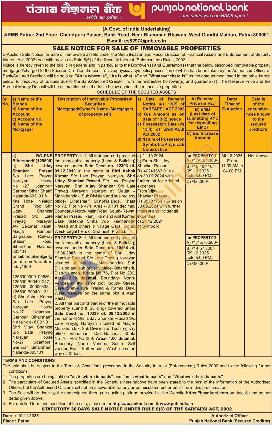 PROPERTY-1: 1. All that part and parcel of the immovable property (Land & Building) covered under Sale Deed no. 12393 dt. 01.12.2010 in the name of Shri Ashok Kumar S/o Late Prayag Narayan, Shri Uday Shankar Prasad S/o Late Prayag Narayan, Shri Vijay Shankar S/o Late Prayag Narayan situated at Mauja Mahikhandak, Sub Division and sub registry office- Biharsharif, Distt-Nalanda, Khata No 73, Plot No 471, Area -10.701 decimal. Boundary-North- Main Road, South-Rewati Raman Prasad, Ramji Ram and Anil Kumar, East- Sulekha Sinha W/o Ramnandan Prasad and others & village Garai Bigha, West- Legal heirs of Shamesh Prasad