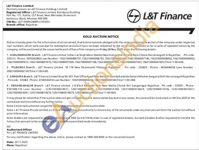 L&T Finance Ltd. Gold Auctions Auction in Hanumangarh