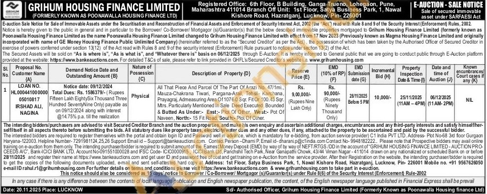 All That Piece And Parcel Of The Part Of Arazi No. 47/1mi., Mauza-Chakrana Tiwari, Pargana-Arail, Tehsil Karchana, Prayagraj, Admeasuring Area Of 1076.0 Sqr. Fit Or 100.43 Sqr. Mtrs. Particularly Mentioned In Sale Deed Executed. Bounded & Butted As Under: East:- Plot Of Other, West:- Pot Of Naveen, North:- 15 Fit Road, South:- Plot Of Other