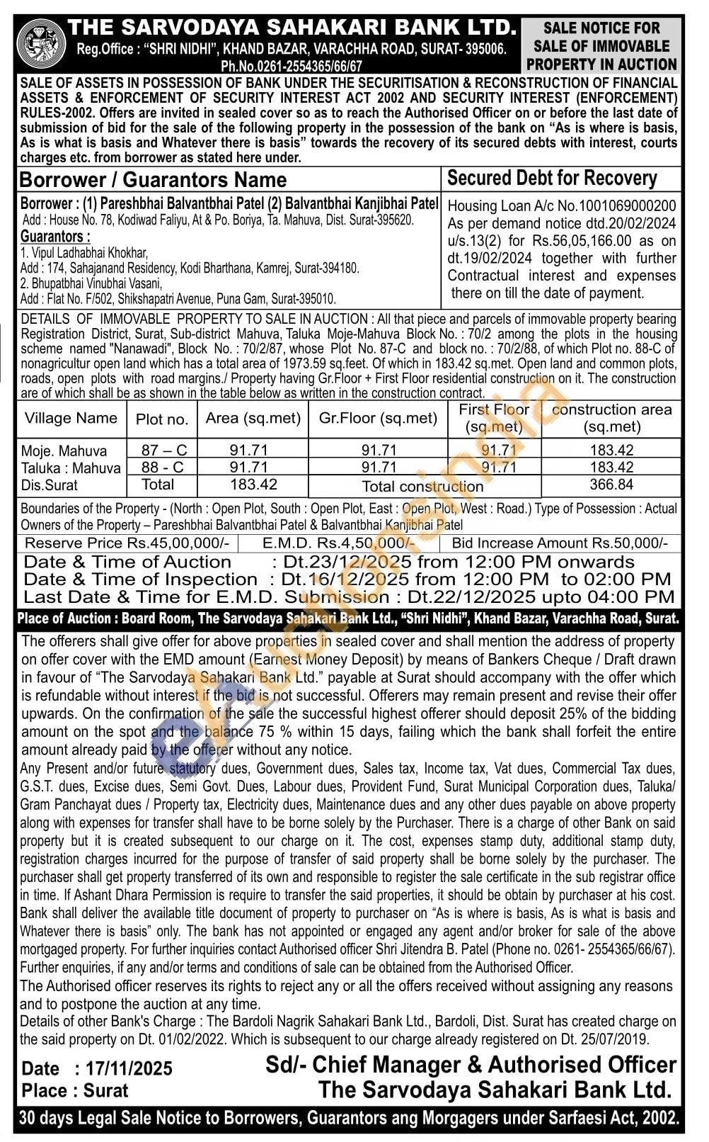 DETAILS OF IMMOVABLE PROPERTY TO SALE IN AUCTION: All that piece and parcels of immovable property bearing Registration District, Surat, Sub-district Mahuva, Taluka Moje-Mahuva Block No.: 70/2 among the plots in the housing scheme named "Nanawadi", Block No.: 70/2/87, whose Plot No. 87-C and block no.: 70/2/88, of which Plot no. 88-C of nonagricultur open land which has a total area of 1973.59 sq.feet. Of which in 183.42 sq.met. Open land and common plots, roads, open plots with road margins./ Property having Gr. Floor + First Floor residential construction on it. The construction are of which shall be as shown in the table below as written in the construction contract Boundaries of the Property (North: Open Plot, South: Open Plot, East: Open Plot, West: Road.) Type of Possession: Actual Owners of the Property - Pareshbhai Balvantbhai Patel & Balvantbhai Kanjibhai Patel