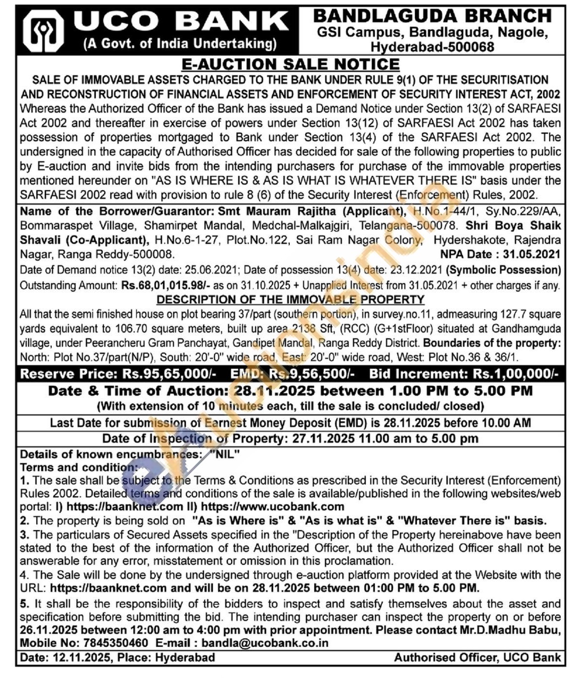 All that the semi finished house on plot bearing 37/part (southern portion), in survey.no.11, admeasuring 127.7 square yards equivalent to 106.70 square meters, built up area 2138 Sft, (RCC) (G+1stFloor) situated at Gandhamguda village, under Peerancheru Gram Panchayat, Gandipet Mandal, Ranga Reddy District. Boundaries of the property: North: Plot No.37/part(N/P), South: 20'-0" wide road, East: 20'-0" wide road, West: Plot No.36 & 36/1