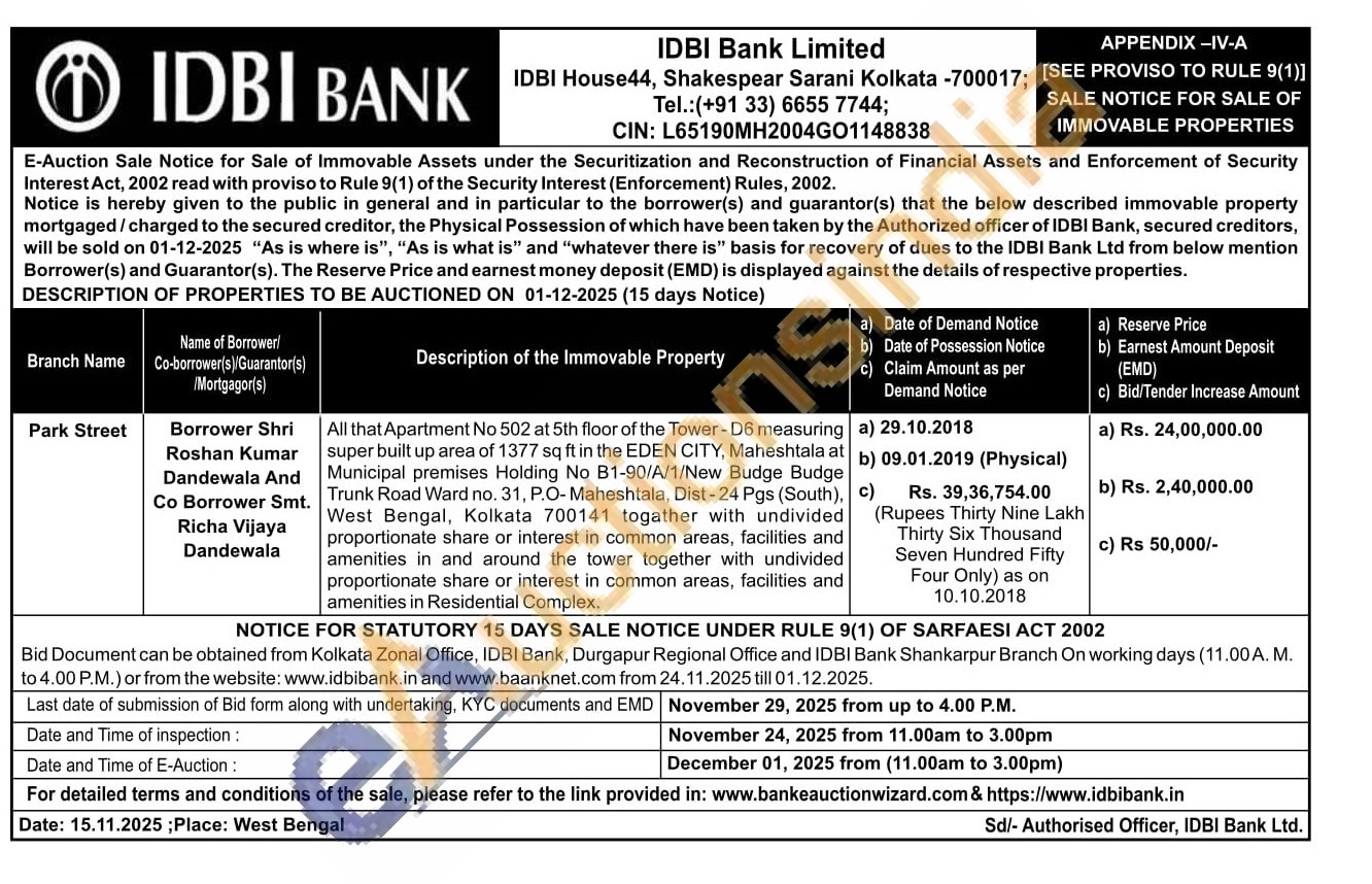All that Apartment No 502 at 5th floor of the Tower-D6 measuring super built up area of 1377 sq ft in the EDEN CITY, Maheshtala at Municipal premises Holding No B1-90/A/1/New Budge Budge Trunk Road Ward no. 31, P.O-Maheshtala, Dist-24 Pgs (South), c) West Bengal, Kolkata 700141 togather with undivided proportionate share or interest in common areas, facilities and amenities in and around the tower together with undivided proportionate share or interest in common areas, facilities and amenities in Residential Complex.