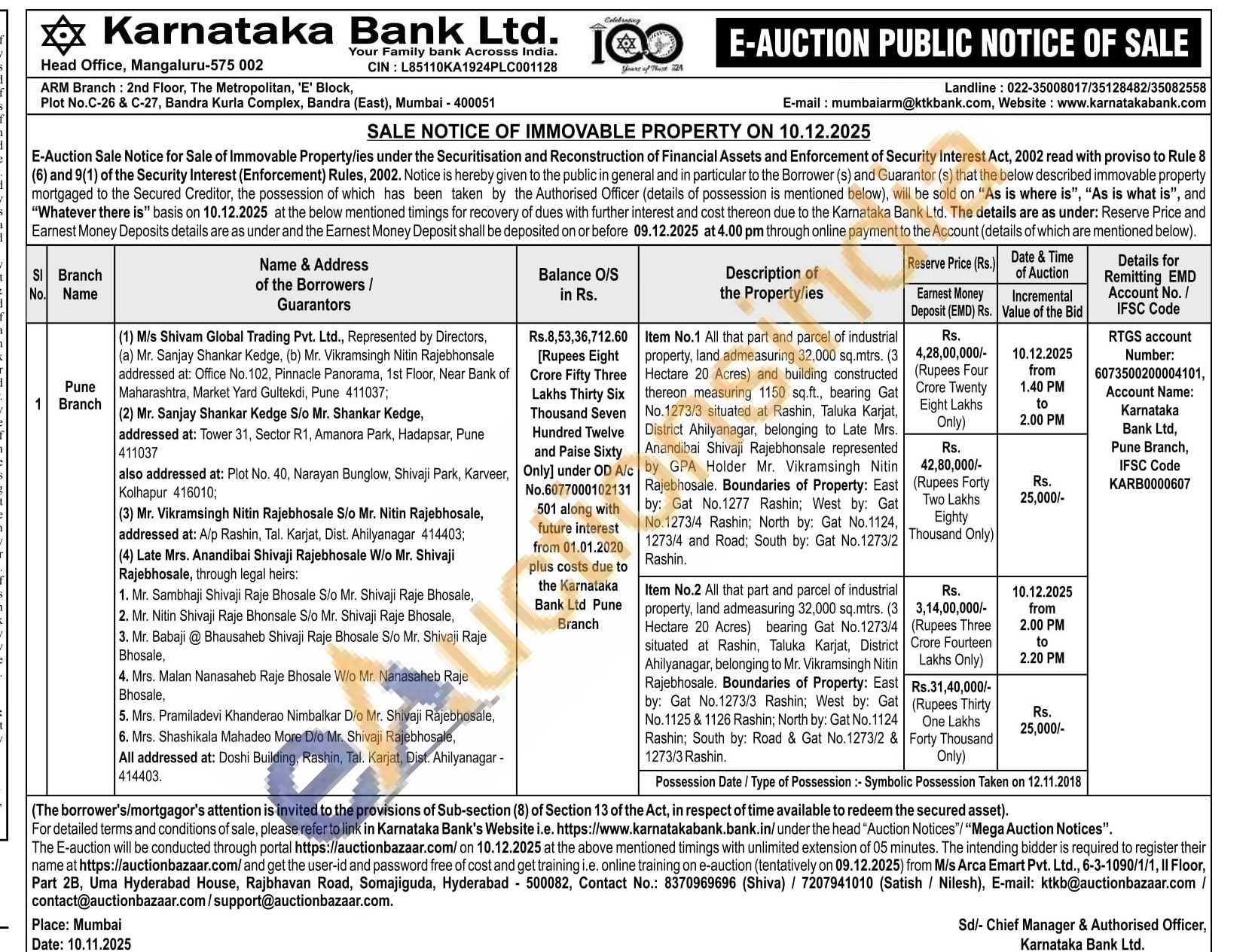 Item No.2 All that part and parcel of industrial property, land admeasuring 32,000 sq.mtrs. (3 Hectare 20 Acres) bearing Gat No. 1273/4 situated at Rashin, Taluka Karjat, District Ahilyanagar, belonging to Mr. Vikramsingh Nitin Rajebhosale. Boundaries of Property: East by: Gat No.1273/3 Rashin; West by: Gat No.1125 & 1126 Rashin; North by: Gat No. 1124 Rashin; South by: Road & Gat No.1273/2 & 1273/3 Rashin.