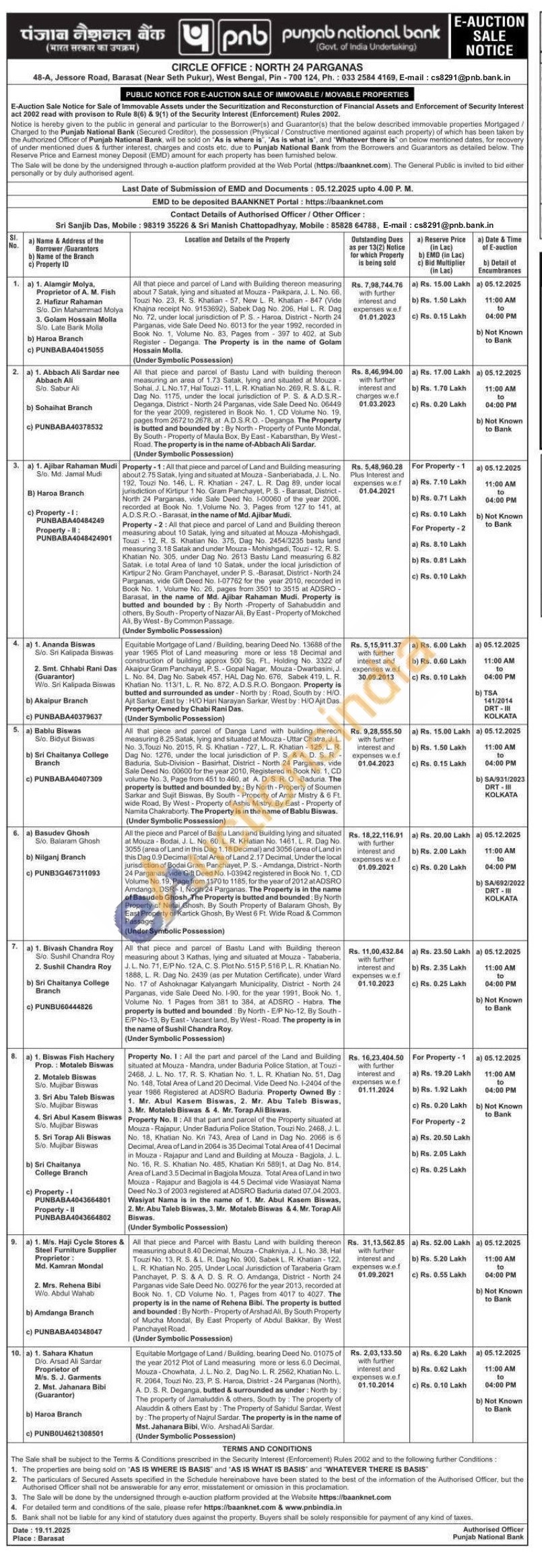 Contact No : Sri Sanjib Das, Mobile: 98319 35226 & Sri Manish Chattopadhyay, Mobile: 85828 64788, E-mail: cs8291@pnb.bank