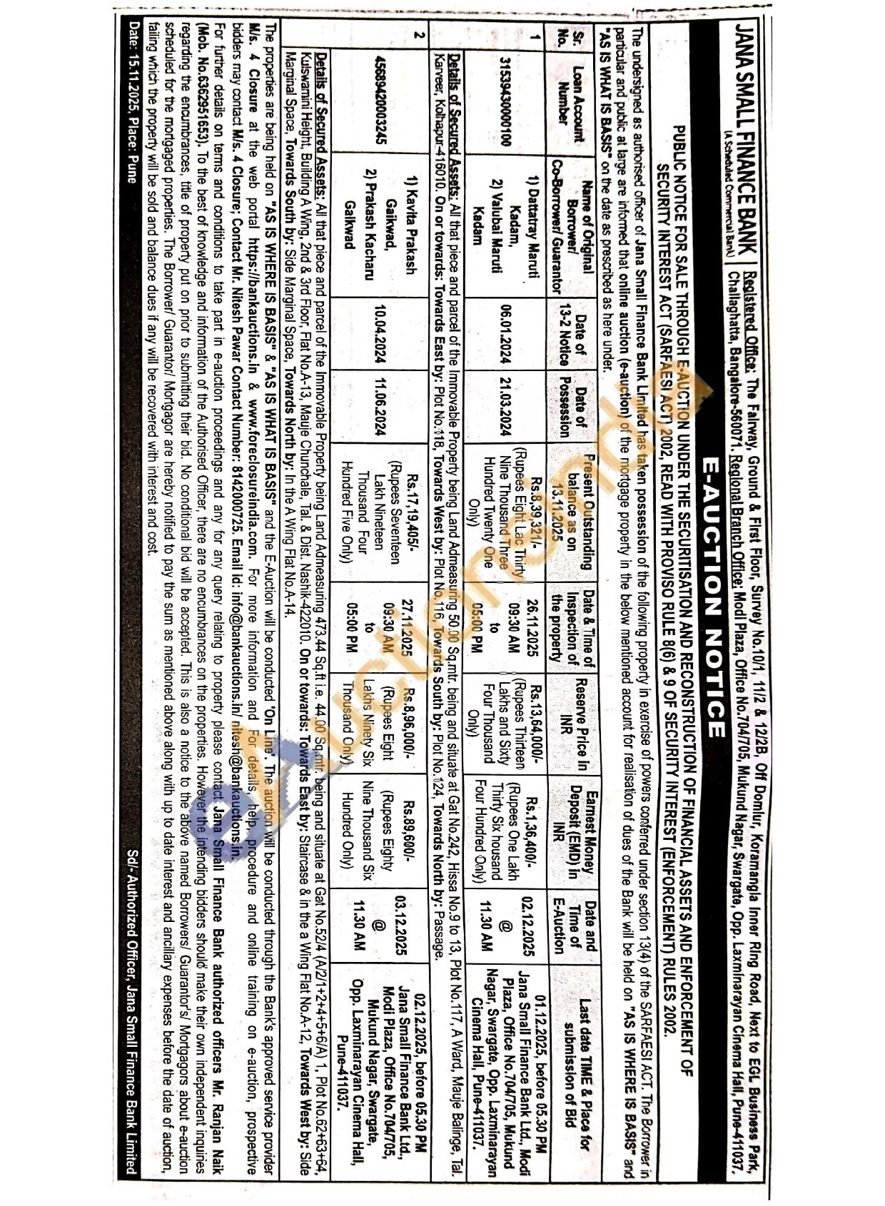Details of Secured Assets: All that piece and parcel of the Immovable Property being Land Admeasuring 50.00 Sq.mtr. being and situate at Gat No.242, Hissa No.9 to 13, No.117, A Ward, Mauje Balinge, Tal. Karveer, Kolhapur-416010. On or towards: Towards East by: Plot No. 118, Towards West by: Plot No. 116, Towards South by: Plot No. 124, Towards North by: Passage