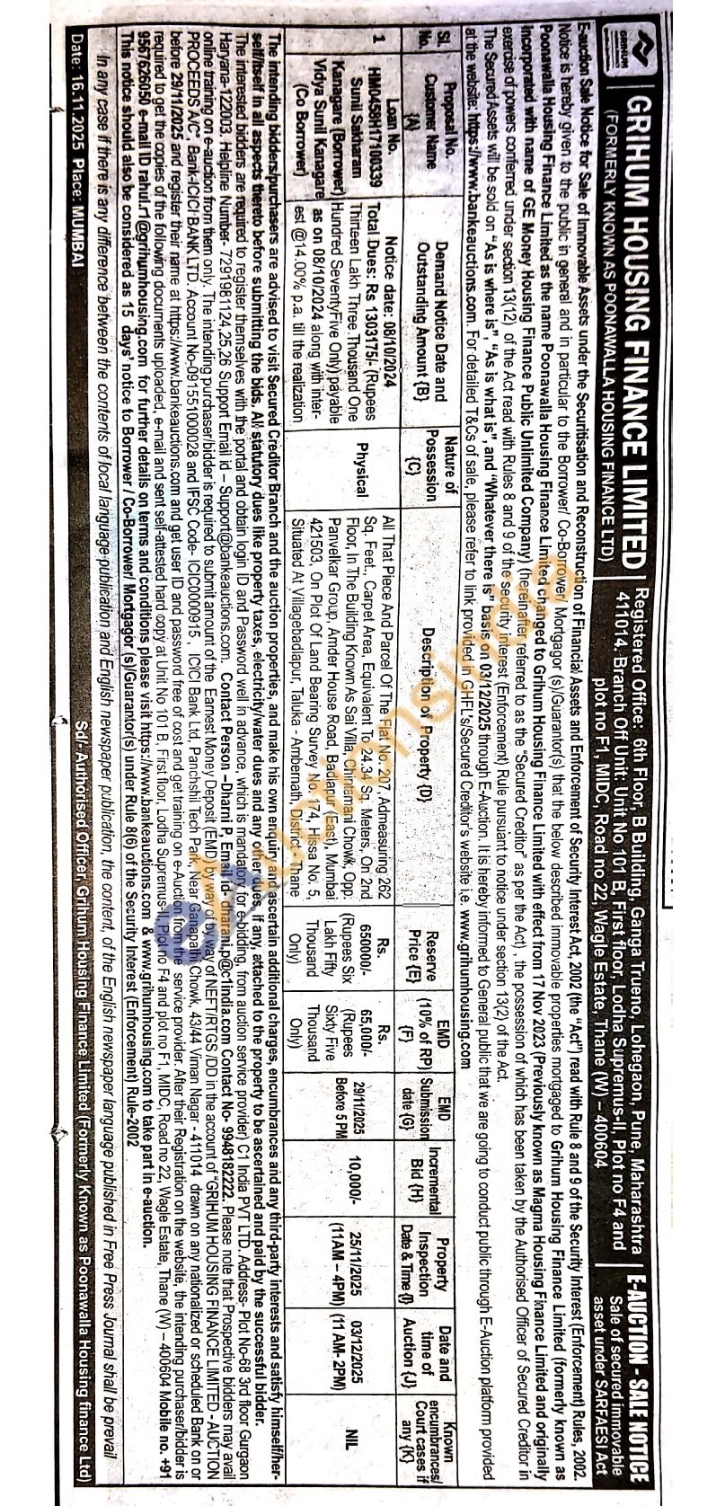 All That Piece And Parcel Of The Flat No. 207, Admeasuring 262 Sq. Feet, Carpet Area, Equivalent To 24.34 Sq. Meters, On 2nd Floor, In The Building Known As Sal Villa, Chintamani Chowk, Opp. Panvelkar Group, Amder House Road, Badiapur (East), Mumbai 421503, On Plot Of Land Bearing Survey No. 174, Hissa No. 5, Situated At Villagebadlapur, Taluka Ambernath, District - Thane