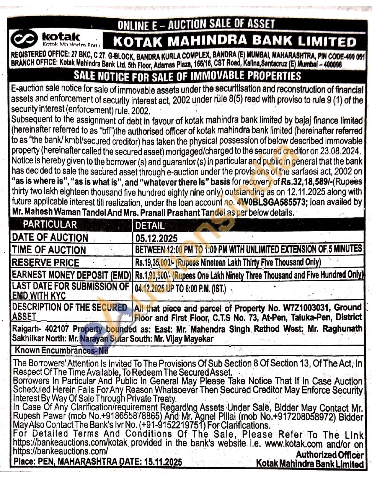 All that piece and parcel of Property No. W7Z1003031, Ground Floor and First Floor, C.T.S No. 73, At-Pen, Taluka-Pen, District Raigarh- 402107 Property bounded as: East: Mr. Mahendra Singh Rathod West: Mr. Raghunath Sakhilkar North: Mr. Narayan Sutar South: Mr. Vijay Mayekar