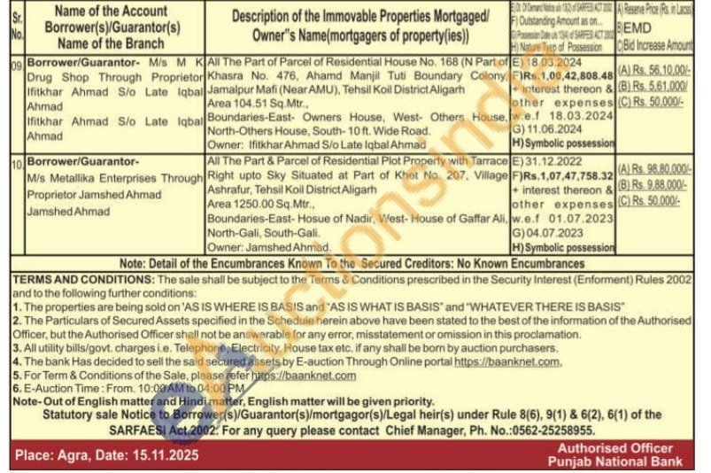 KAll The Part of Parcel of Residential House No. 168 (N Part of Khasra No. 476, Ahamd Manjil Tuti Boundary Colony, Jamalpur Mafi (Near AMU), Tehsil Koil District Aligarh Area 104.51 Sq.Mtr., Boundaries-East- Owners House, West- Others House, North-Others House, South-10 ft. Wide Road. Owner: Ifitkhar Ahmad S/o Late Iqbal Ahmad