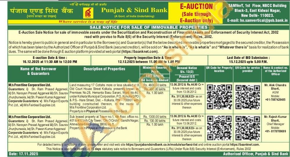 Land measuring 17 Cottahs more or less situated at 8 Old Court House Street Kolkata, presently known as Premises No.28, Hemanta Basu Sarani, Ward No.46, under Kolkata Municipal Corporation, P.O. Kolkata GPO & P.S.- Hare Street, Dist. - Kolkata, PIN-700001 with building constructed thereon, in the name of M/s Frontline Corporation Ltd.