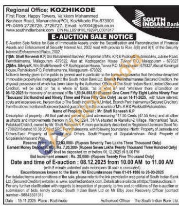Description of property All that part and parcel of land admeasuring 117.50 Cents (47.55 Arest and all other usulructs and improvements thereon in By. No. 294, 31/1A situated in Alanallur-2 Whage, Mannarkkad Taluk Palakkad Distrid, owned by Mr. Shafi Reneesh KP more parto dally described in Registered Jermam Deed No 1708/2018 dated 10.08.2018 of SRO Perinthalmanna, with folkowing boundaries:-North Property of Jameela and Others East: Property of Jameela and Others South Property of Gopalakrishnan. Viest Property of Gopalakrishnan and Way