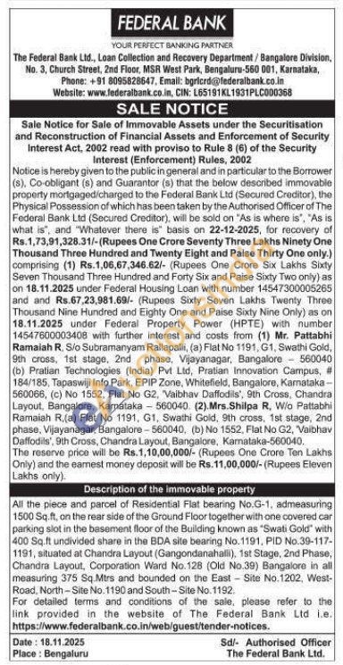 All the piece and parcel of Residential Flat bearing No.G-1, admeasuring 1500 Sq.ft, on the rear side of the Ground Floor together with one covered car parking slot in the basement floor of the Building known as "Swati Gold with 400 Sq.ft undivided share in the BDA site bearing No.1191, PID No.39-117-1191, situated at Chandra Layout (Gangondanahalli), 1st Stage, 2nd Phase, Chandra Layout, Corporation Ward No.128 (Old No.39) Bangalore in all measuring 375 Sq.Mtrs and bounded on the East Site No.1202, West-Road, North-Site No. 1190 and South-Site No. 1192.
