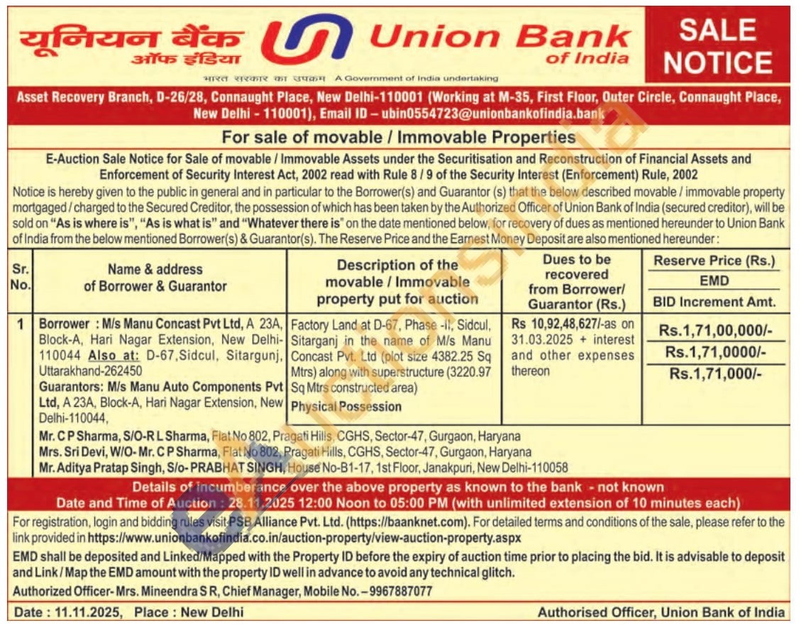Factory Land at D-67, Phase -II, Sidcul. Sitarganj in the name of M/s Manu Concast Pvt. Ltd (plot size 4382.25 Sq Mtrs) along with superstructure (3220.97 Sq Mirs constructed area)
