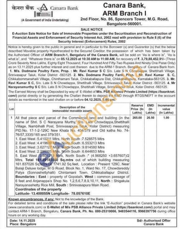 All that piece and parcel of the Commercial land and building (in the name of Shri. S C Narayana Murthy, S/o. Late Chowdappa, Shettihalli Village, Nambihalli Post, Srinivasapura Taluk, Kolar District) measuring PID.No. 17-1-2-129C New Khata No. 404/379 and Old katha No. 74-76/57,3335/165 and 379/351.