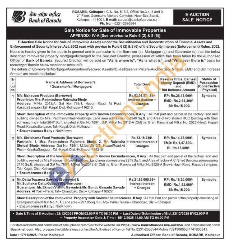 Short Description of the Immovable Property with Known Encumbrances, If Any: All that part and parcel of the factory land and building owned by Mrs. PadmashriRajendraBhoje, Land area admeasuring 2275 Sq.ft. and Area of factory A.C. Shed Building admeasuring 2170 Sq.ft. situated at Gat No.789/1, Milkat No. 2012-B (Old) i.e. Gram Panchayat Milkat No. 2525-A (New), Hupri Road, KasabaSangaon, Tal.-Kagal, Dist.-Kolhapur.