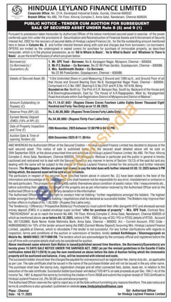 "1/3rd Undivided Share in Land Measuring 2 Ground and 1390 sq. ft., and Ground Floor of all that House and Ground Bearing Door No.8. Karpagambal Nagar Road, Chennai-600004, Comprised in C.C.No. 1897, Bearing O.S.No.2101 and R.S.No. 1674/40, Being Bounded on the: North by: The Plot of C.R. Narayan Rao, South by: Backyard of the House and K.N.Shanmughasundaram, East by: The House of A.R. Rajagopalan, West by: Karpagambal Road And situate within Sub Registration District of Mylapore and District of Madras".