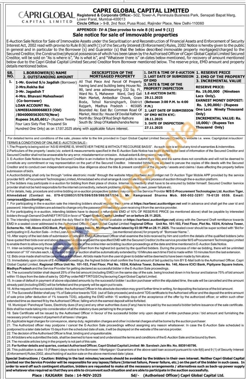 All That Piece And Parcel Of Property having land and building being House No. 80, land area admeasuring 232 Sq. Ft., Ward No. 5, Mahaveer Ward, Darji Gali Main Market, Ambedkar Chowk, Gram Boda, Tehsil Narsinghgarh, District Rajgarh, Madhya Pradesh 465685