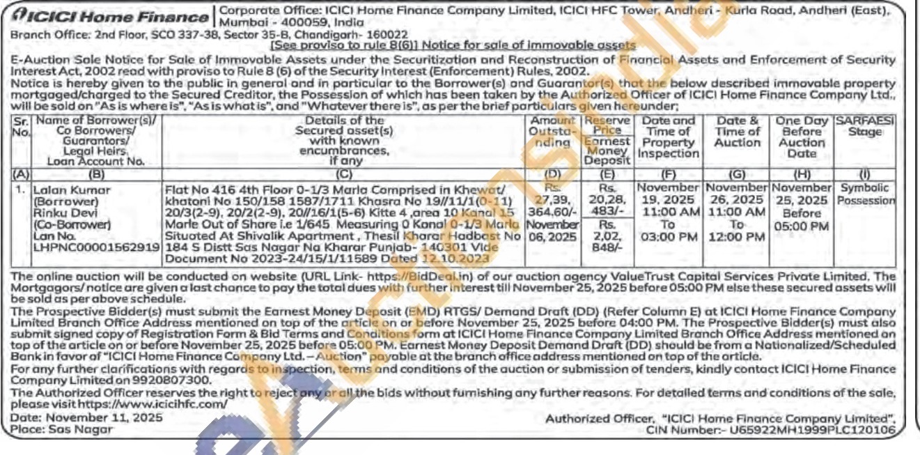 Flat no 416,4th floor , Comprised in Khewat/khatoni No 150/158 1587/1711 Khasra No 19/11/1(0-11) 20/3(2-9), 20/2(2-9), 20//16/1(5-6) Kitte 4, area 10 Kanal 15 Marle Out of Share i.e 1/645 Measuring 0 Konal 0-1/3 Marla Situated At Shivalik Apartment, Thesil Kharar Hadbast No 184 S Distt Sas Nagar Na Kharar Punjab-140301 Vide Document No 2023-24/15/1/11589 Dated 12.10.2023