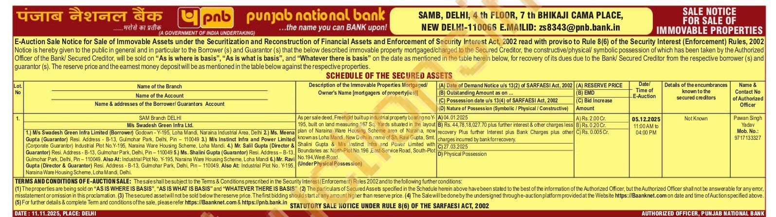 As per sale deed, Freehold built up industrial property bearing no Y-195, built on land measuring 167 Sq. Yards situated in the layout plan of Naraina Ware Housing Scheme area of Naraina, now known as Loha Mandi, New Delhi in name of Sh. Ravi Gupta, Smt. Shalini Gupta & Mis Instinct Infra and Power Limited with Boundaries as: North-Plot No. 196, East-Service Road, South-Plot A) C B) rec D) No. 194, West-Road