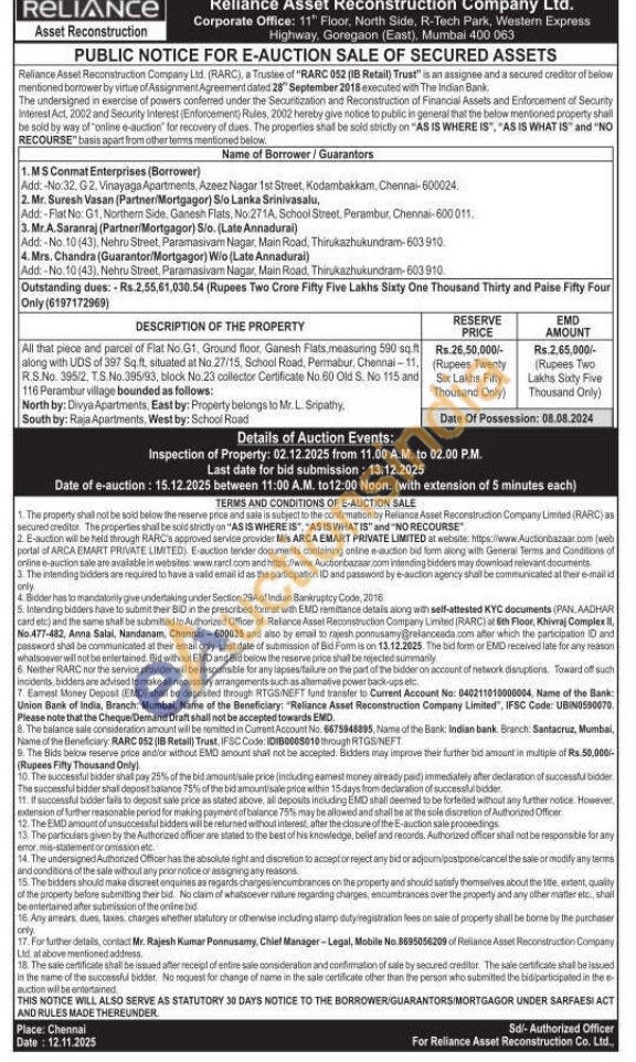 All that piece and parcel of Flat No.G1, Ground floor, Ganesh Flats, measuring 590 sq.ft along with UDS of 397 Sq.ft., situated at No.27/15, School Road, Permabur, Chennai-11, R.S.No. 395/2, T.S.No.395/93, block No. 23 collector Certificate No.60 Old S. No 115 and 116 Perambur village bounded as follows: North by: Divya Apartments, East by: Property belongs to Mr. L. Sripathy, South by: Raja Apartments. West by: School Road
