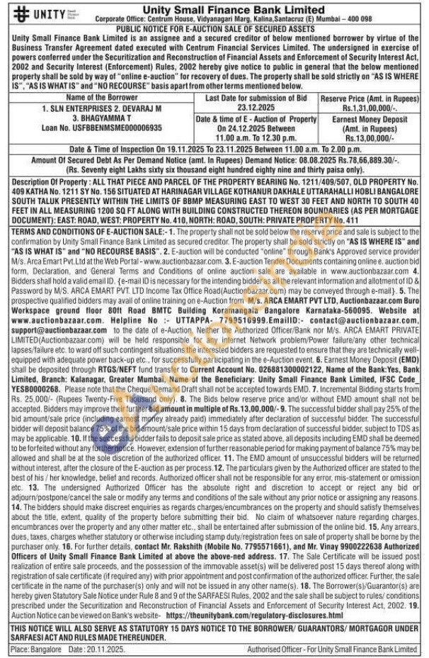 Description Of Property: ALL THAT PIECE AND PARCEL OF THE PROPERTY BEARING No. 1211/409/507, OLD PROPERTY No. 409 KATHA No. 1211 SY No. 156 SITUATED AT HARINAGAR VILLAGE KOTHANUR DAKHALE UTTARAHALLI HOBLI BANGALORE SOUTH TALUK PRESENTLY WITHIN THE LIMITS OF BBMP MEASURING EAST TO WEST 30 FEET AND NORTH TO SOUTH 40 FEET IN ALL MEASURING 1200 SQ FT ALONG WITH BUILDING CONSTRUCTED THEREON BOUNDARIES (AS PER MORTGAGE DOCUMENT): EAST: ROAD, WEST: PROPERTY No. 410, NORTH: ROAD, SOUTH: PRIVATE PROPERTY No. 411