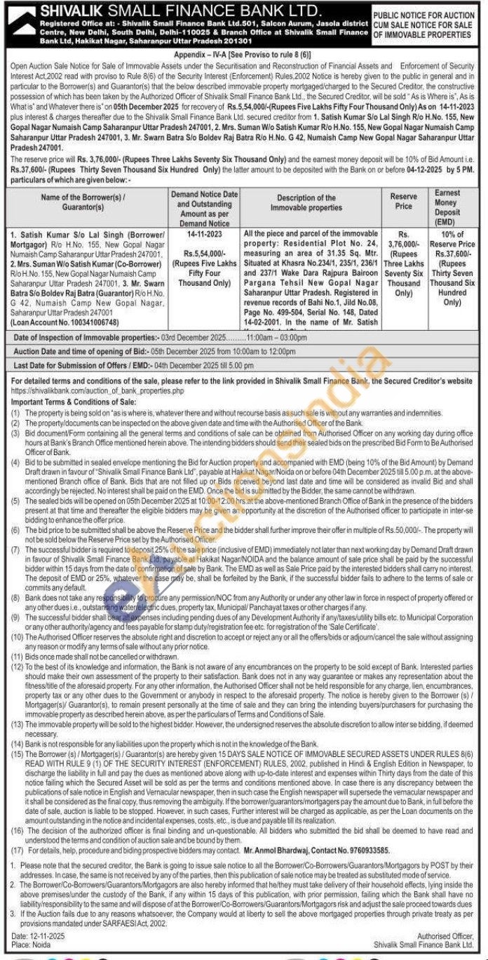 All the piece and parcel of the immovable property: Residential Plot No 24 measuring an area of 31.35 Sq. Mtr. Situated at Khasra No.234/1, 235/1, 236/1 and 237/1 Wake Dara Rajpura Bairoon Pargana Tehsil New Gopal Nagar Saharanpur Uttar Pradesh. Registered in revenue records of Bahi No.1, Jild No.08. Page No. 499-504, Sorial No. 148, Dated 14-02-2001, in the name of Mr. Satish