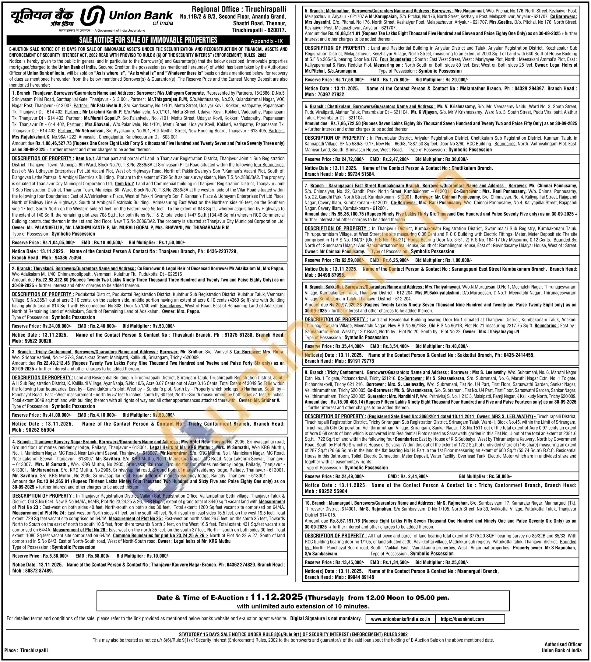 DESCRIPTION OF PROPERTY: In Perambalur District, Ariyalur Registration District, Chettikulam Sub Registration District, Kunnam Taluk, in Kannapadi Village, SF.No 536/3-9.17, New No-660/3, 1887.50 Sq.feet, Door No 3/60, RCC Building. Boundaries: North: Vaithiyalingam Plot, East: Maniyar Land, South: Srinivasan House, West: Road. Type of Possession: Symbolic Possession