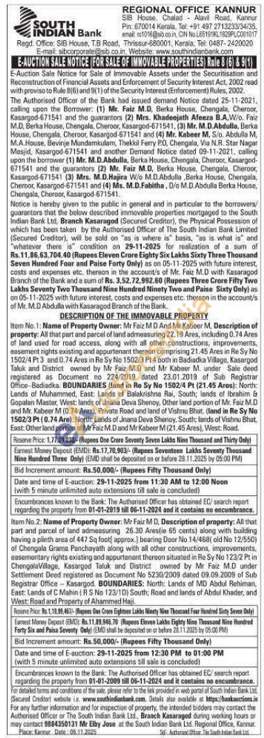 Description of property: All that part and parcel of land admeasuring 26.30 Arestie 65 cents) along with building having a plinth ares of 447 Sq foot approx.) bearing Door No 14/468( old No 12/550) of Chengala Grama Panchayath along with all other constructions, improvements, easementary rights existing and appurtenant thereon situated in Re Sy No 123/2 PLin ChengalaVillage, Kasargod Taluk and District owned by Mr Faiz M.D under Settlement Deed registered as Document No 5230/2009 dated 09.09.2009 of Sub Registrar Office- Kasargod. BOUNDARIES: North: Lands of MD Abdul Rehiman. East: Lands of C Mahin (RS No 123/10) South: Road and lands of Abdul Khader, and West Road and Property of Ahammed Haji