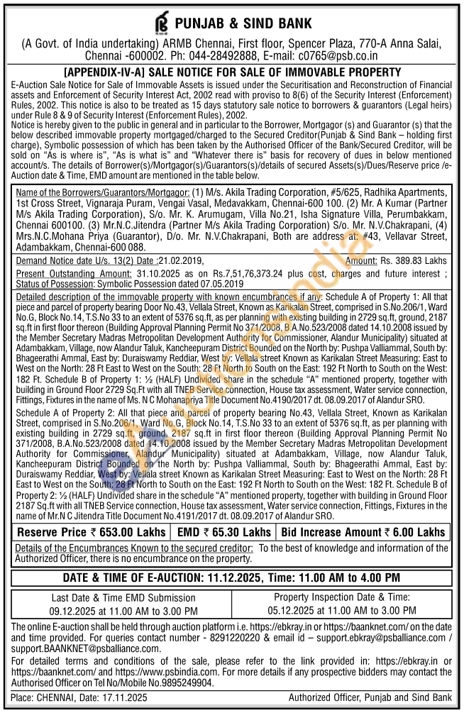 Schedule A of Property 2: All that piece and parcel of property bearing No.43, Vellala Street, Known as Karikalan Street, comprised in S.No.206/1, Ward No.G, Block No.14, T.S.No 33 to an extent of 5376 sq.ft, as per planning with existing building in 2729 sq.ft, ground, 2187 sq.ft in first floor thereon (Building Approval Planning Permit No 371/2008, Β.Α.Νο.523/2008 dated 14.10.2008 issued by the Member Secretary Madras Metropolitan Development Authority for Commissioner, Alandur Municipality) situated at Adambakkam, Village, now Alandur Taluk, Kancheepuram District Bounded on the North by: Pushpa Valliammal, South by: Bhageerathi Ammal, East by: Duraiswamy Reddiar, West by: Vellala street Known as Karikalan Street Measuring: East to West on the North: 28 Ft East to West on the South: 28 Ft North to South on the East: 192 Ft North to South on the West: 182 Ft. Schedule B of Property 2:% (HALF) Undivided share in the schedule "A" mentioned property, together with building in Ground Floor 2187 Sq.ft with all TNEB Service connection, House tax assessment, Water service connection, Fittings, Fixtures in the name of Mr.N C Jitendra Title Document No.4191/2017 dt. 08.09.2017 of Alandur SRO