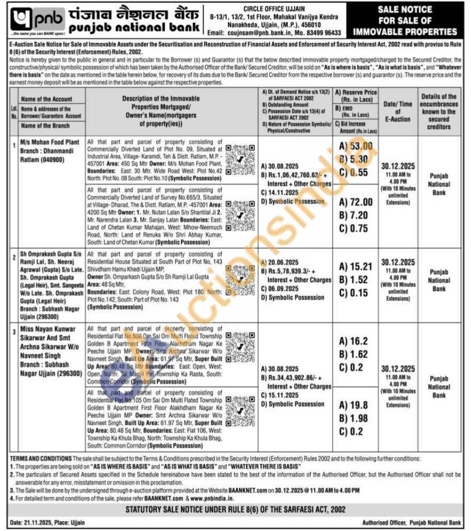 All that part and parcel of property consisting of Commercially Diverted Land of Survey No.655/3, Situated at Village-Dharad, The & Distt. Ratlam, M.P. -457001 Area: 4200 Sq Mtr Owner: 1. Mr. Nutan Lalan S/o Shantilal Ji 2 Mr. Narendra Lalan 3. Mr. Sanjay Lalan Boundaries: East Land of Chetan Kumar Mahajan, West: Mhow-Neemuch Road, North: Land of Renuka W/o Shri Abhay Kumar, South: Land of Chetan Kumar (Symbolic Possession)