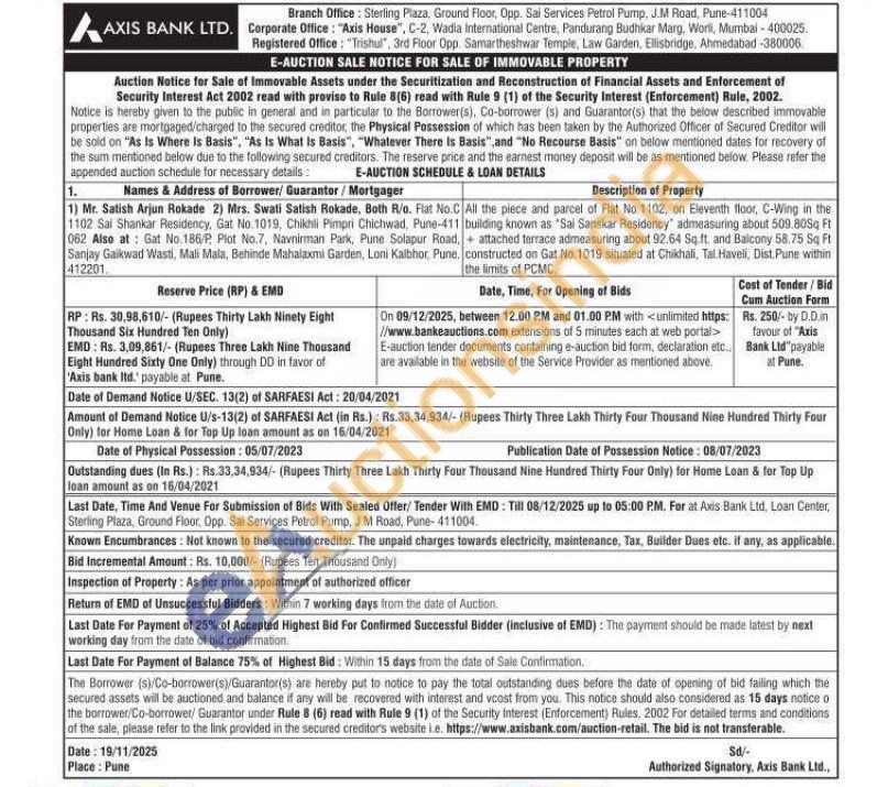 All the piece and parcel of Flat No 1102, on Eleventh floor, C-Wing in the building known as "Sai Sanskar Residency" admeasuring about 509.80Sq Ft , attached terrace admeasuring about 92.64 Sq.ft. and Balcony 58.75 Sq Ft constructed on Gat No. 1019 situated at Chikhali, Tal. Haveli, Dist. Pune within the limits of PCMC