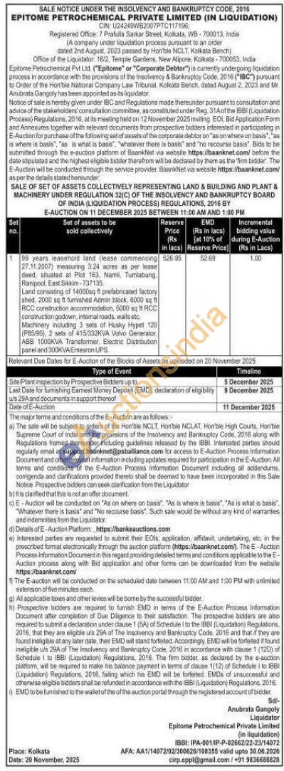 Land consisting of 14000sq ft prefabricated factory shed, 2000 sq ft fumished Admin block, 6000 sq ft RCC construction accommodation, 5000 sq ft RCC construction godown, intemal roads, walls etc.