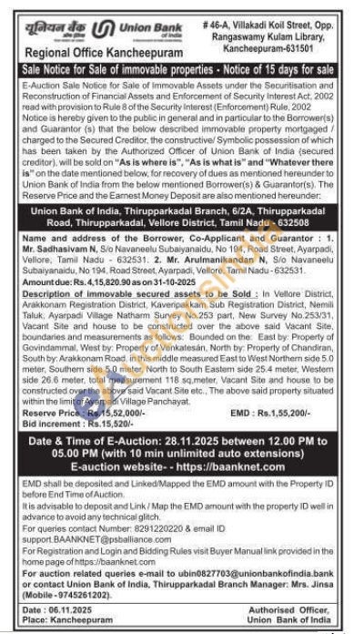 In Vellore District, Arakkonam Registration District, Kaveripakkam Sub Registration District, Nemili Taluk. Ayarpadi Village Natharm Survey No.253 part, New Survey No.253/31, Vacant Site and house to be constructed over the above said Vacant Site, boundaries and measurements as follows: Bounded on the East by Property of Govindamnal, West by: Property of Venkatesan, North by: Property of Chandiran, South by: Arakkonam Road, in this middle measured East to West Northern side 5.0 meter, Southem side 5.0 meter, North to South Eastem side 25.4 meter, Western side 26.6 meter, total measurement 118 sq,meter, Vacant Site and house to be constructed over the above said Vacant Site etc., The above said property situated within the limit of Ayarpadi Village Panchayat