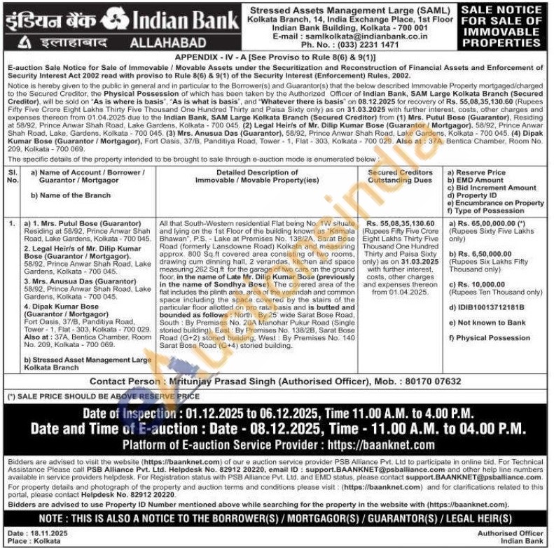 All that South-Westem residential Flat being No. 1W situate and lying on the 1st Floor of the building known as "Kamala Bhawan, P.S. Lake at Premises No. 138/2A, Sarat Bose Road (formerly Lansdowne Road) Kolkata and measuring approx. 800 Sq ft covered area consisting of two rooms. drawing cum dinning hall, 2 verandas, kitchen and space measuring 262 Sq.ft for the garage of two cars on the ground floor, in the name of Late Mr. Dilip Kumar Bose (previously in the name of Sondhya Bose). The covered area of the flat includes the plinth area, area of the verandah and common space including the space covered by the stairs of the particular floor allotted on pro rata basis and is butted and bounded as follows: North By 25 wide Sarat Bose Road, South By Premises No. 20A Manohar Pukur Road (Single storied building), East: By Premises No. 138/28, Sarat Bose Road (G+2) storied building. West: By Premises No. 140 Sarat Bose Road (G+4) storied building