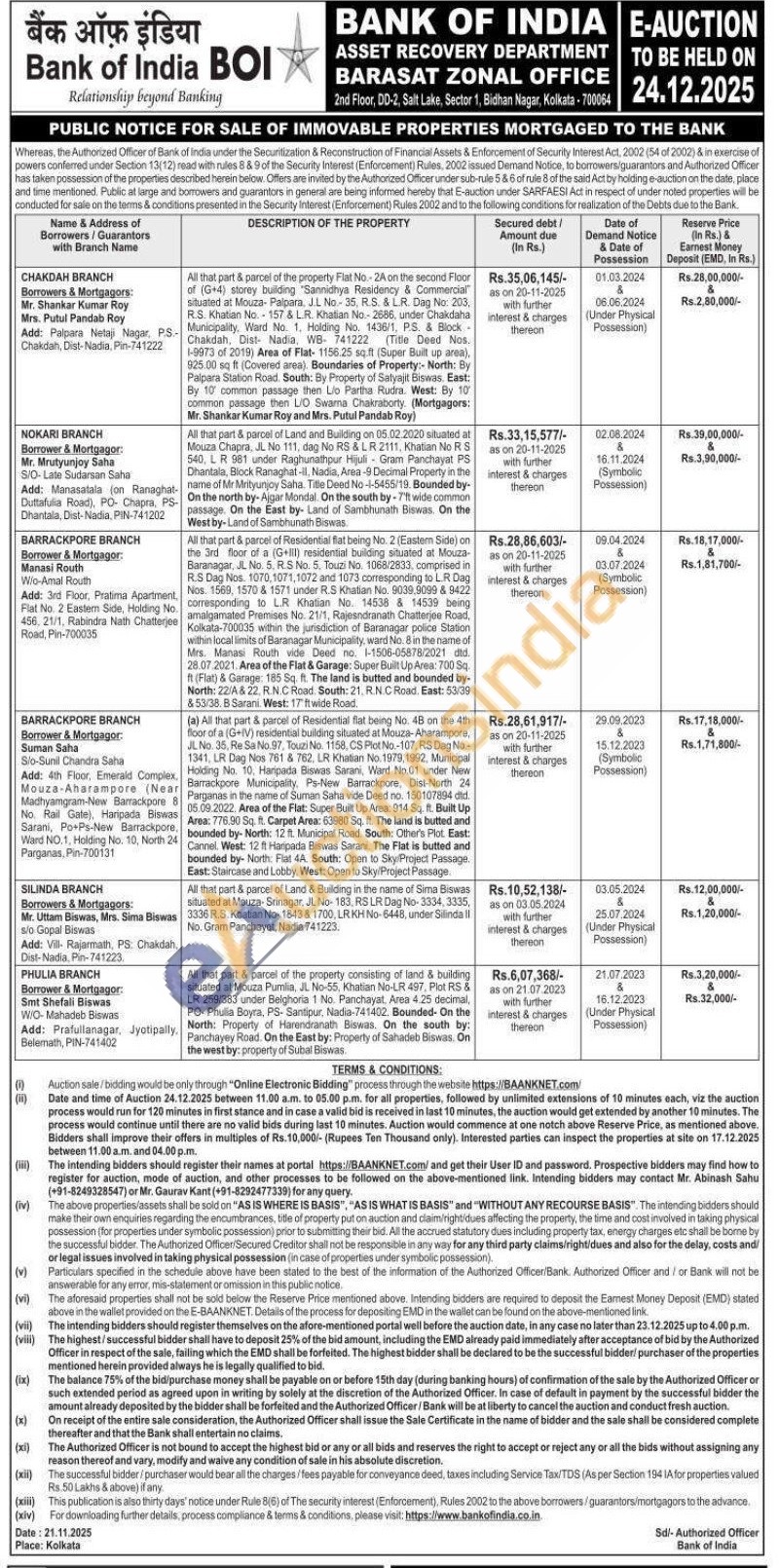 All that part & parcel of the property Flat No.-2A on the second Floor of (G+4) storey building "Sannidhya Residency & Commercial situated at Mouza- Palpara, J.L No.-35, R.S. & L.R. Dag No: 203, R.S. Khatian No.157 & L.R. Khatian No.-2686, under Chakdaha Municipality, Ward No. 1. Holding No. 1436/1, P.S. & Block Chakdah, Dist Nadia, WB- 741222 (Title Dead Nos. 1-9973 of 2019) Area of Flat- 1156.25 sq.ft (Super Built up area), 925.00 sq ft (Covered area). Boundaries of Property:- North: By Palpara Station Road. South: By Property of Satyajit Biswas. East: By 10 common passage then Lio Partha Rudra. West: By 10 common passage then LO Swarna Chakraborty. (Mortgagors: Mr. Shankar Kumar Roy and Mrs. Putul Pandab Roy)
