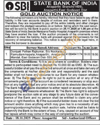 State Bank of India Gold Auctions Auction in Wanaparthy